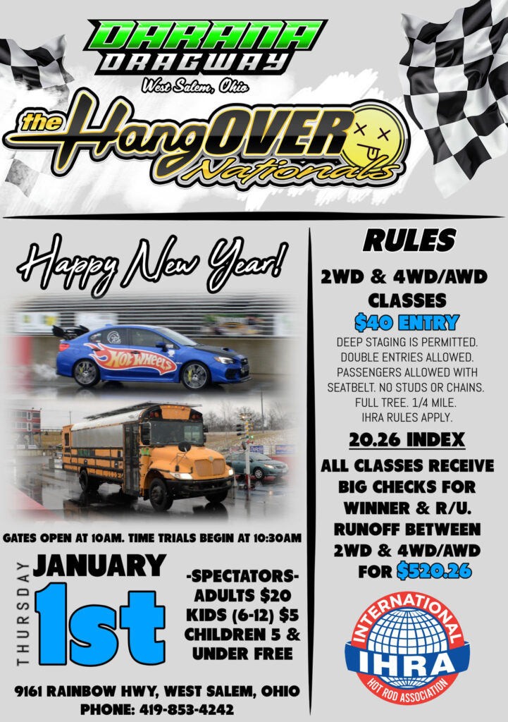 Kicking off the drag racing season at the Hangover Nationals at Darana Dragway – West Salem, Ohio on Thursday January 1st, 2026. Happy New Year!
