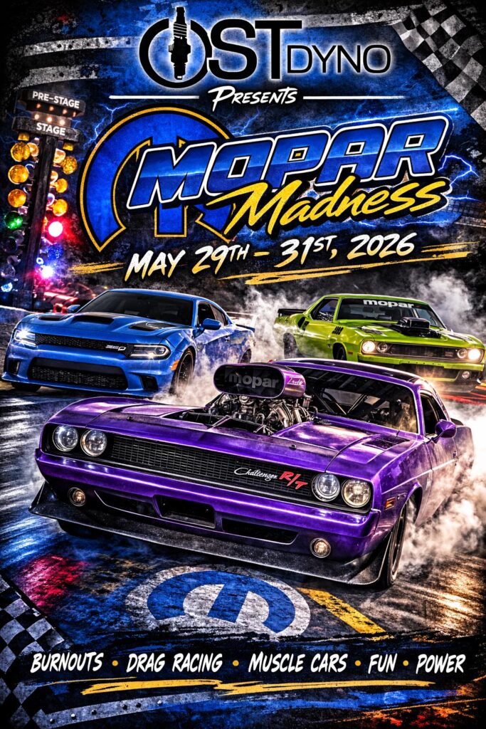 OST Dyno presents the 5th Annual Mopar Madness at 42. An ‘All Mopar’ Drag Race, Car Show and Swap Meet event open to all Mopar powered vehicles on May 29th-31st, 2026. It is hosted at Darana Dragway 42 in West Salem, Ohio.